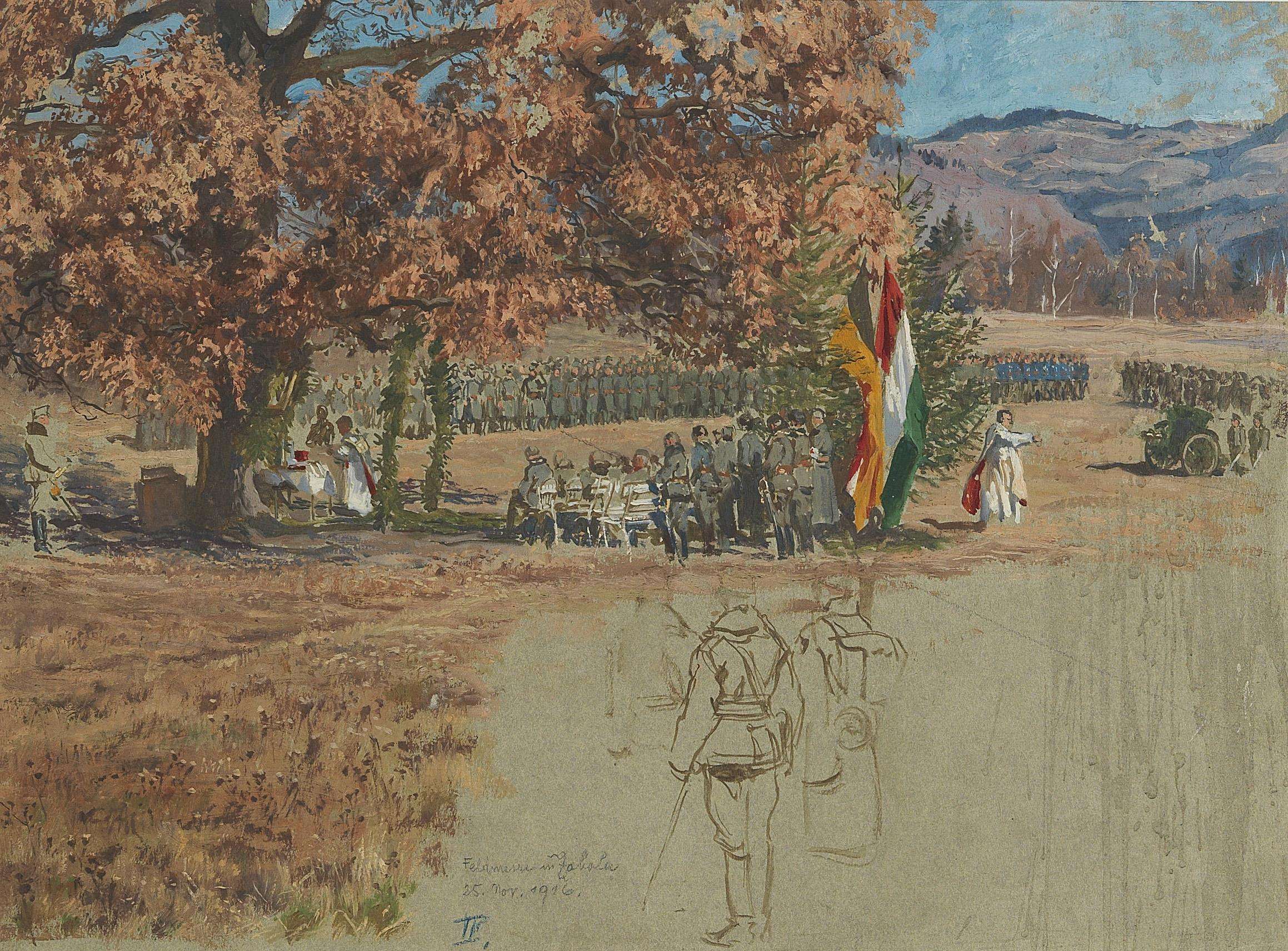 (Znaim 1871-1950 Wien) Feldmesse in Zabola, 25: Nov. 1916, Bleistift und Öl auf Papier, bezeichnet, 31 x 41,5 cm, Passep., gerahmt unter Glas (JZG)
