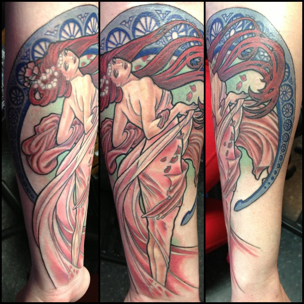 Originally this piece was a Mucha work of art. I recreated his piece "dance" as a tattoo.