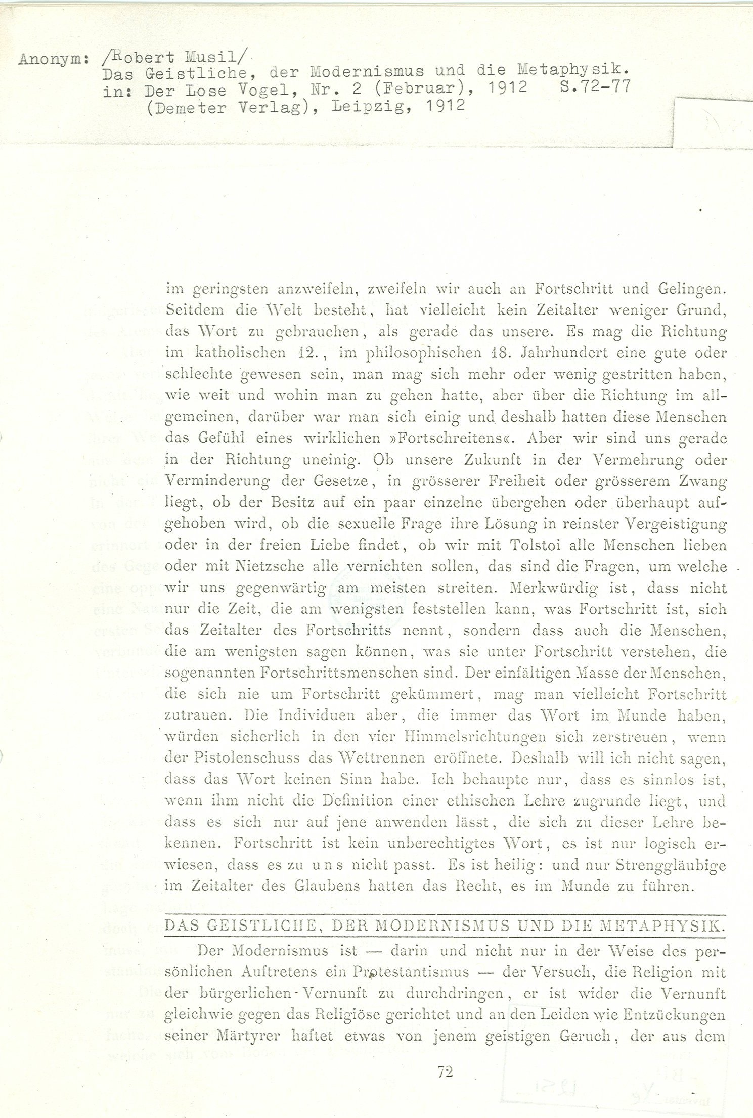 Index of /pd/1942/Robert Musil/Der Mann ohne Eigenschaften (Zürcher Ausgabe)/Drucke/Das Geistliche der Modernismus und die Metaphysik (Der Lose Vogel)
